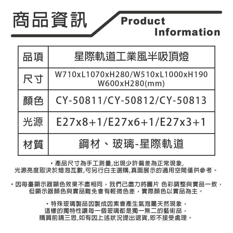 產品尺寸為手工測量,出現少許偏差為正常現象,光源亮度取決於燈泡瓦數,可另行白主選購,真面展示的適用空間僅供參考。
