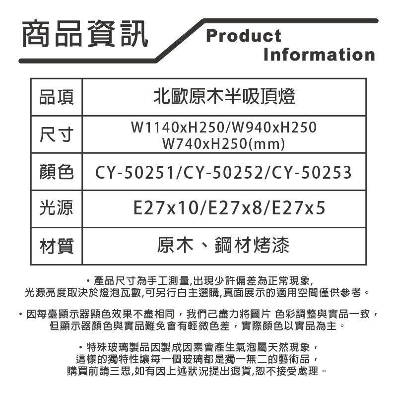 產品尺寸為手工測量,出現少許偏差為正常現象,光源亮度取決於燈泡瓦數,可另行白主選購,真面展示的適用空間僅供參考。